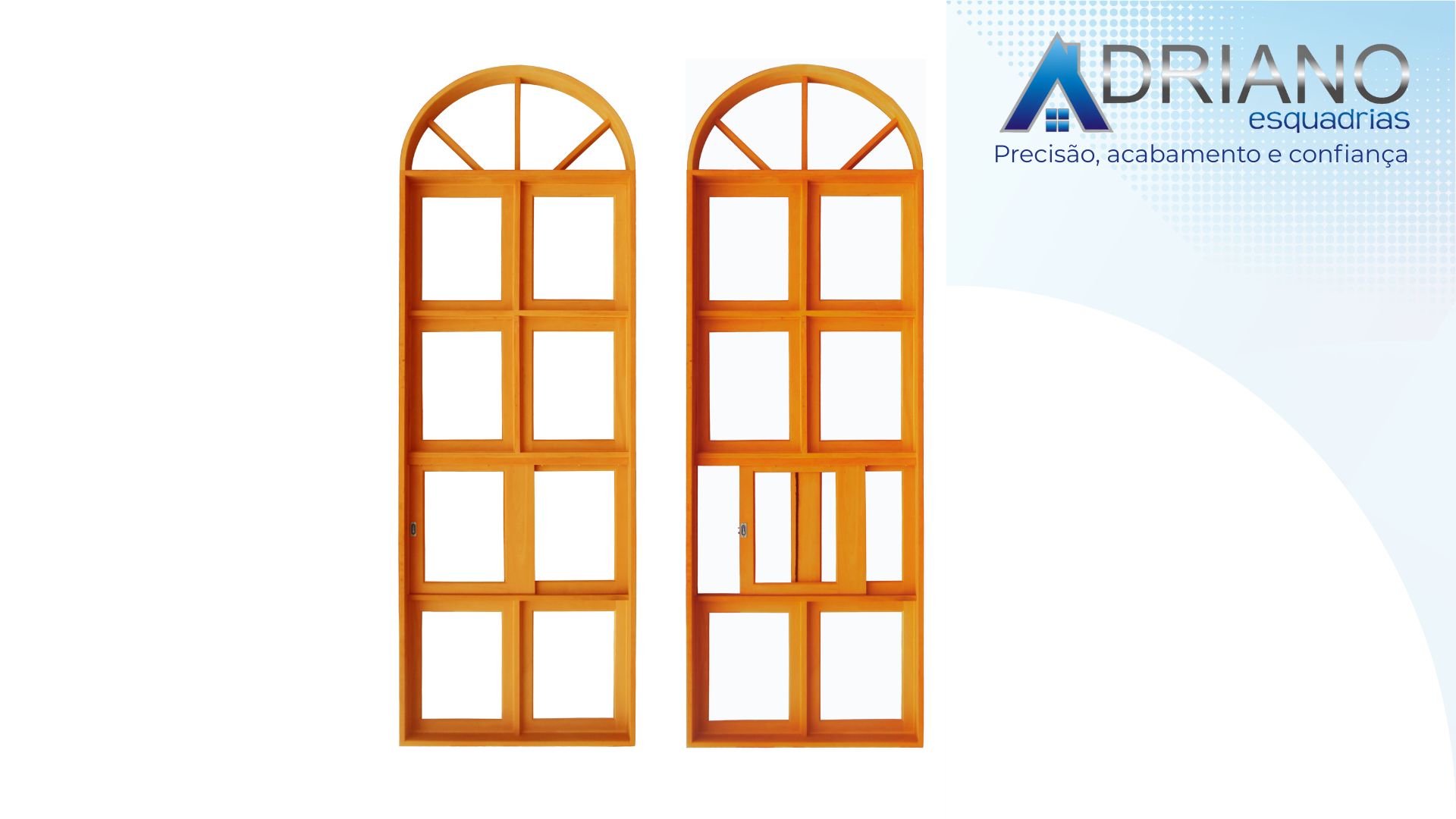 Janela de madeira em arco pleno com módulos fixos e duas folhas de correr vidro panorâmico